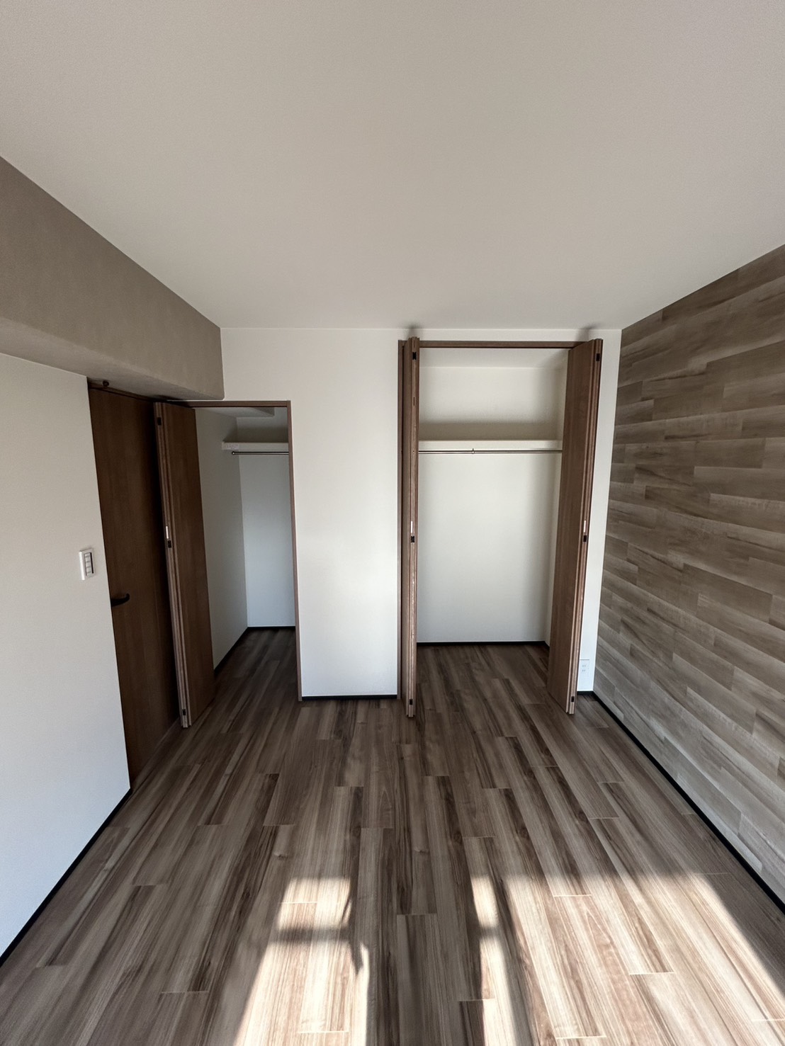 木目調のアクセントクロスとフローリングの統一感により、温かみのある落ち着いた空間に仕上がっています。