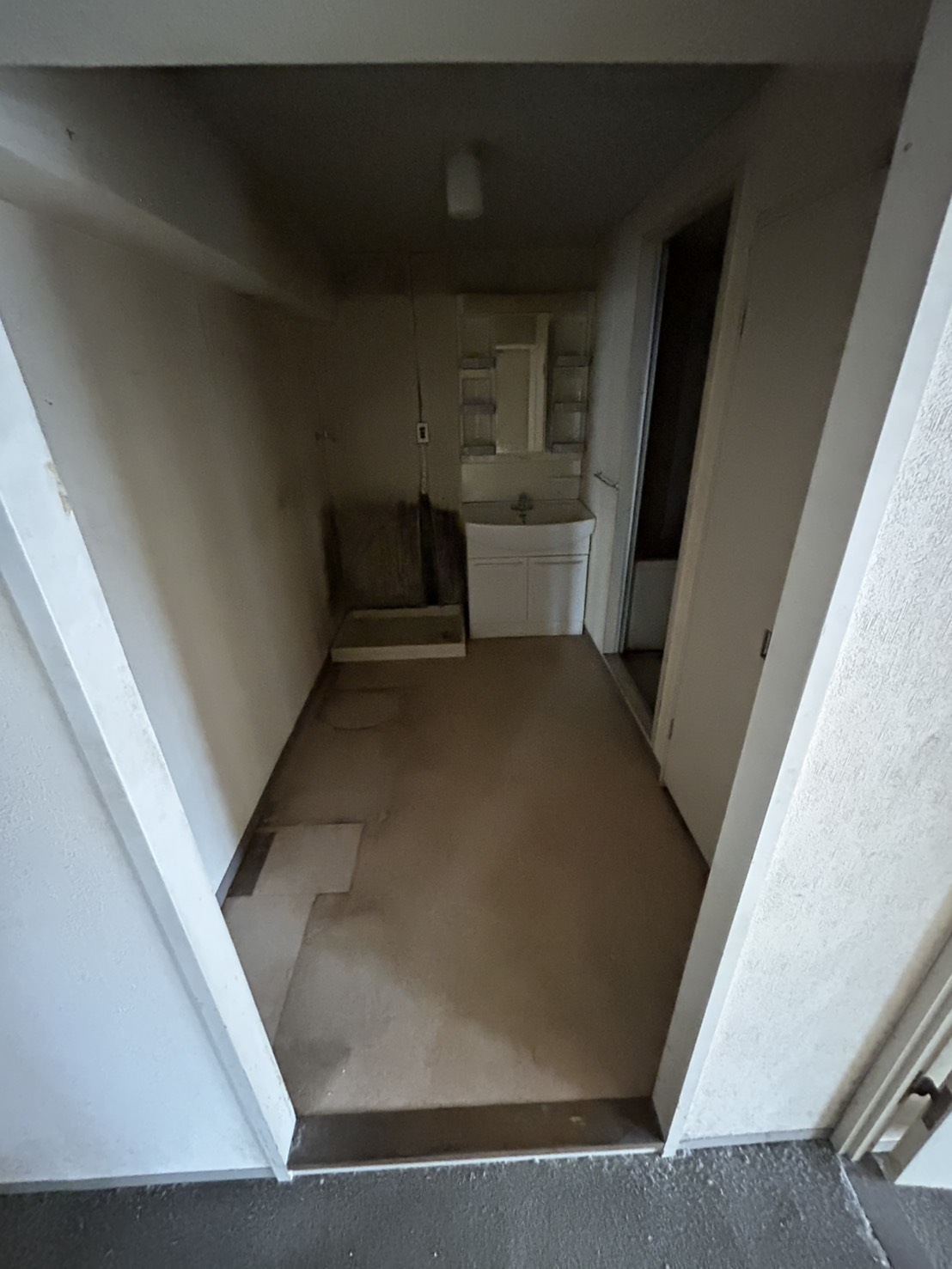施工前は、コンパクトな洗面台が設置されたシンプルな空間で、収納スペースも少なく、全体的に暗い印象でした。